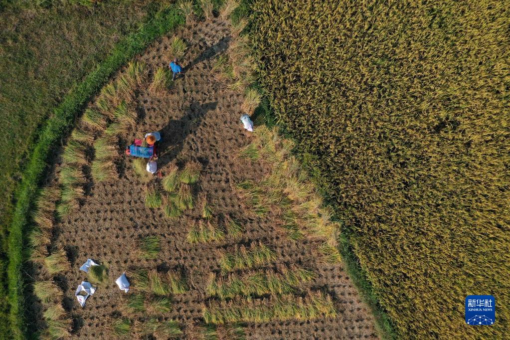 9月1日,村民在贵州省黔东南苗族侗族自治州丹寨县兴仁镇烧茶村稻田里收割水稻(无人机照片)。