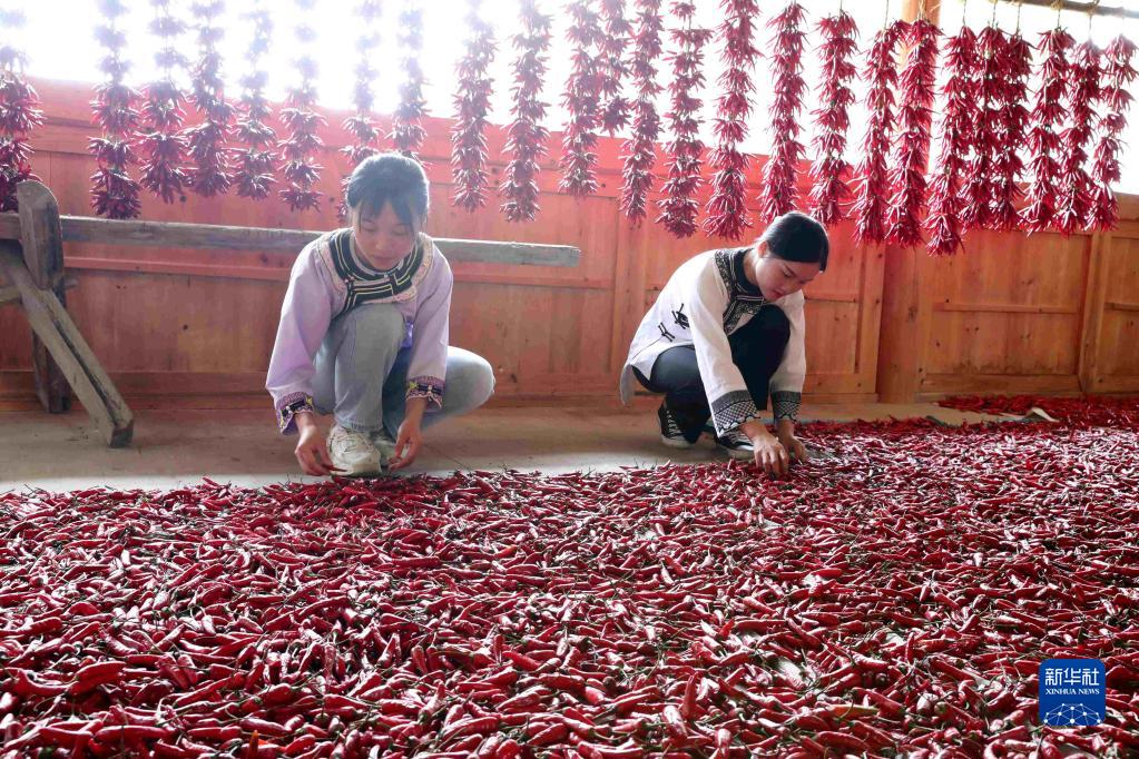 9月1日,在贵州省榕江县平阳乡硐里村,村民在晾晒朝天椒。