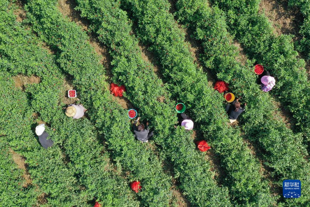 9月1日,河南省宝丰县石桥镇竹园村农民在田间收获草莓椒(无人机照片)。