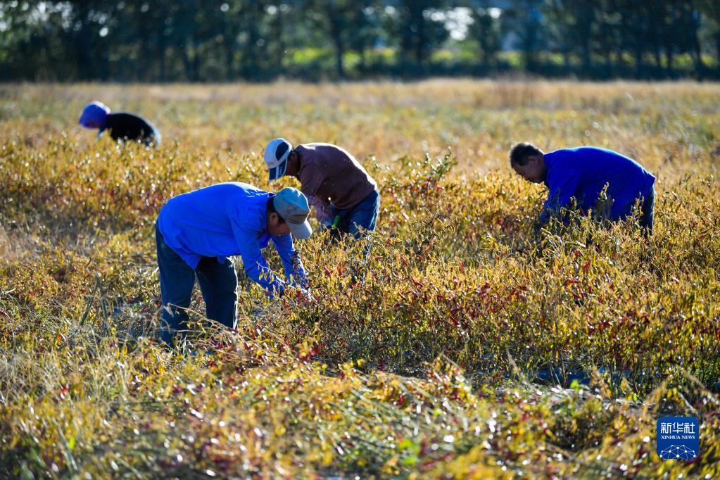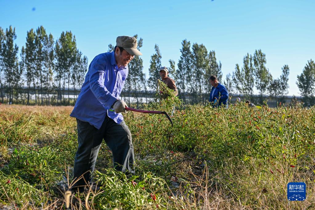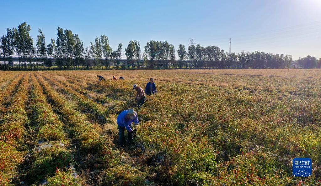 10月16日,在天津市宝坻区王卜庄镇下王各庄村,村民在田间采收辣椒。 新华社记者 孙凡越 摄