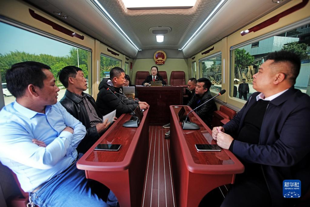 2月20日,在广西柳州市融水苗族自治县融水镇新安村,诉前调解在巡回审判车内进行。