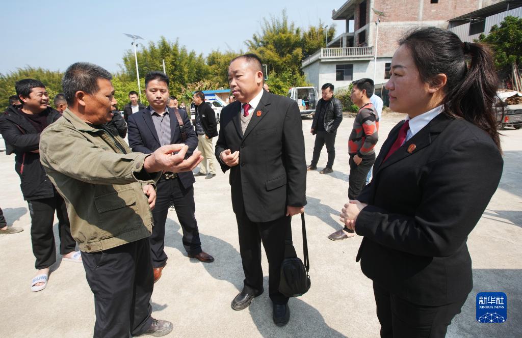 2月20日,在广西柳州市融水苗族自治县融水镇新安村,原告之一(前左一)向法官反映自己的诉求。