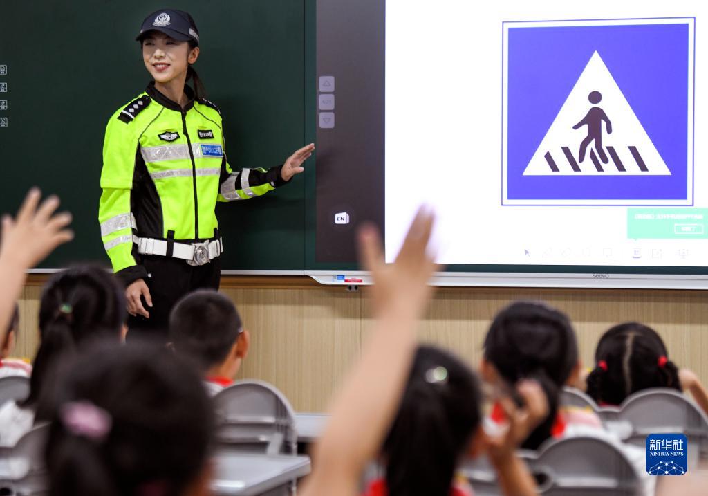 8月28日,在新疆教育学院实验小学,乌鲁木齐市公安局交警支队民警为四年级学生上“开学第一课”,讲解交通安全常识。