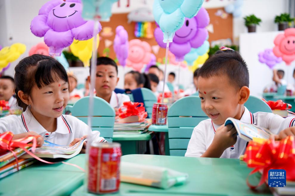 8月28日,在乌鲁木齐市第76小学,一年级新生翻阅新书。