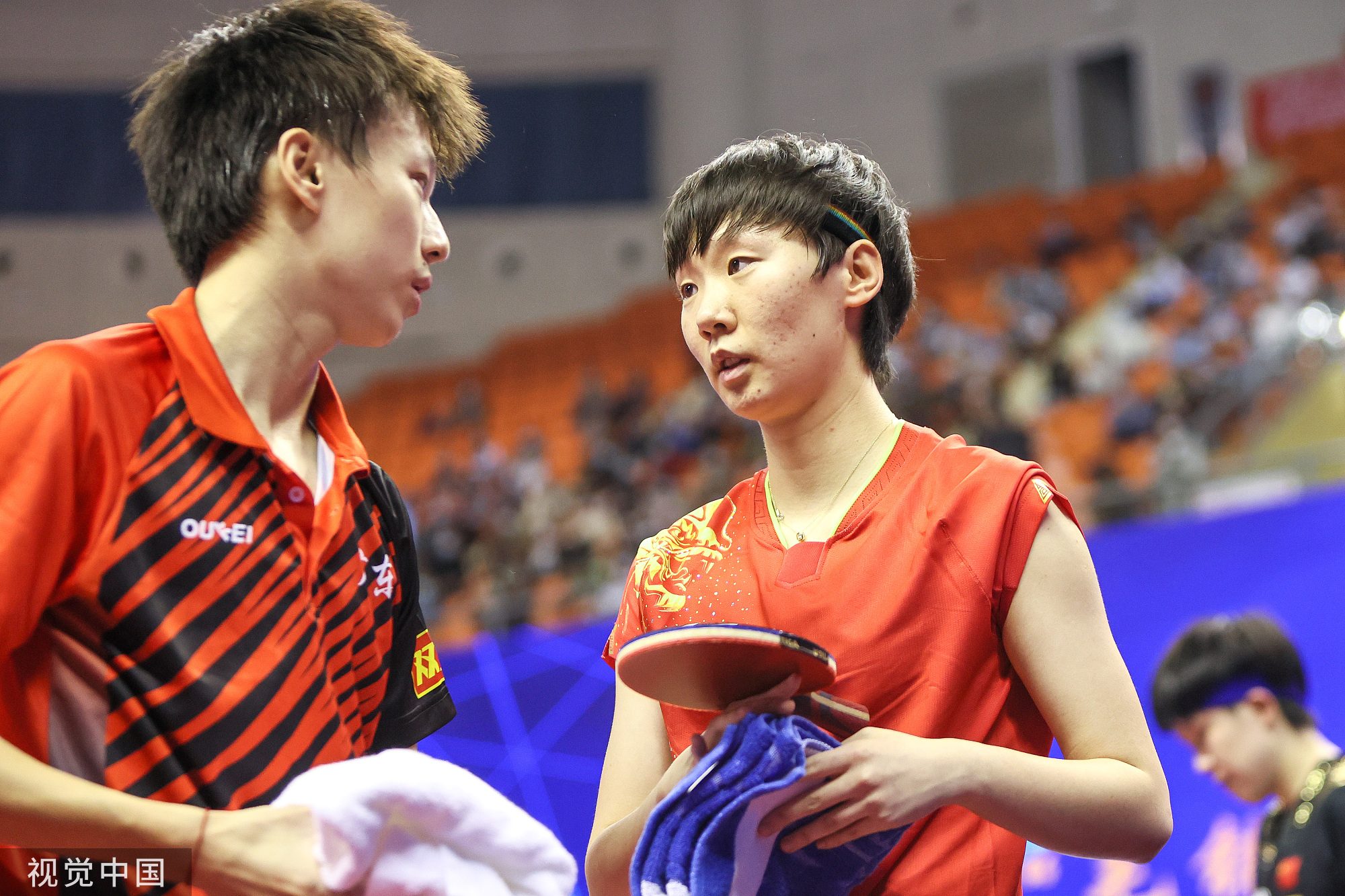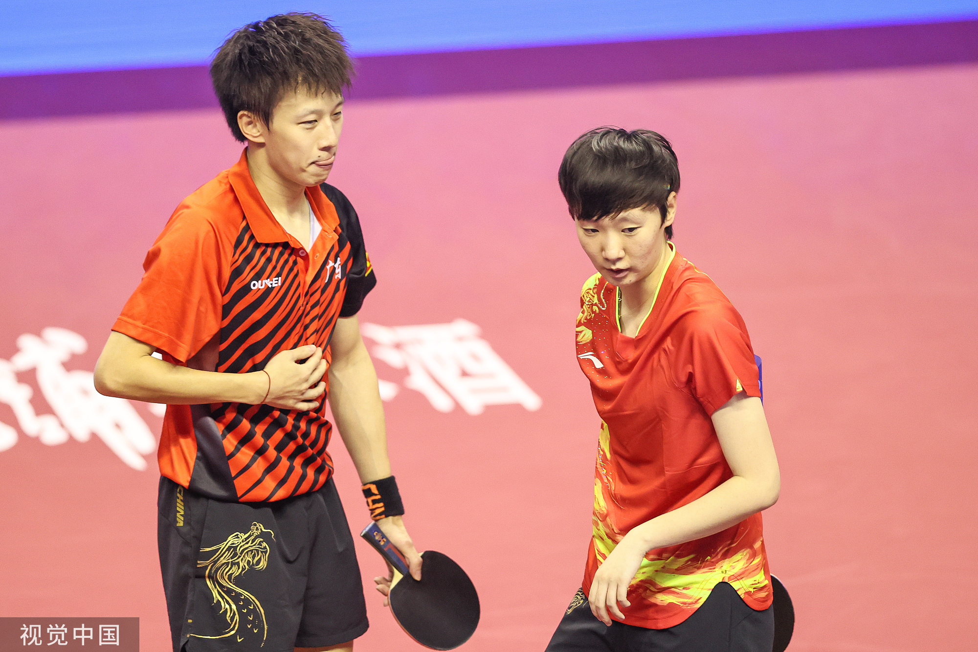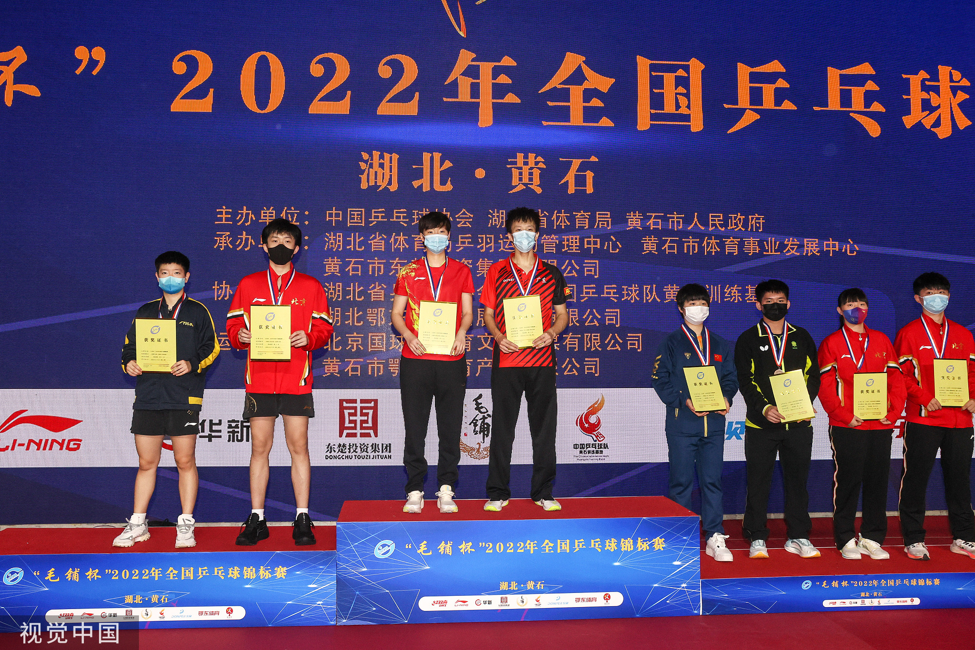 北京时间11月9日晚上,2022年全国乒乓球锦标赛决出混双冠军,世乒赛冠军王楚钦/孙颖莎对阵林高远/王曼昱。两对组合激战六局,林高远/王曼昱总比分4-2击败王楚钦/孙颖莎夺冠。赛后,二人在领奖时互相戴金牌。