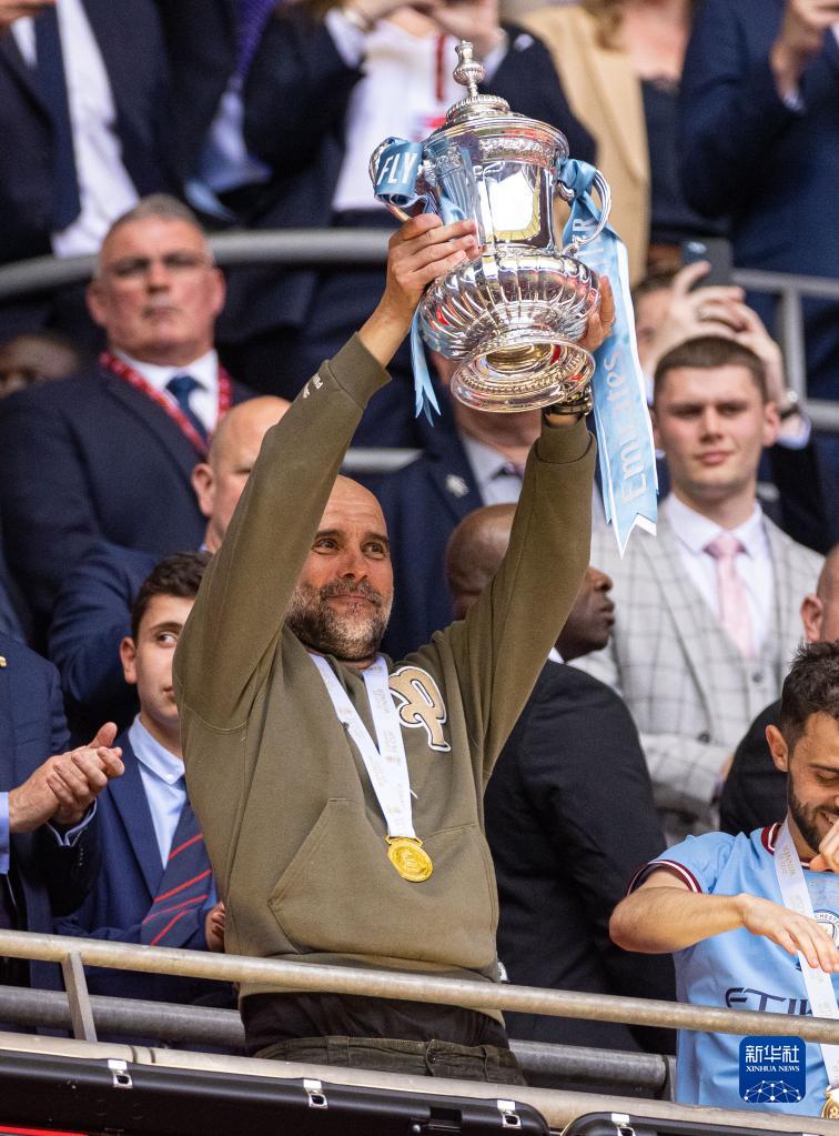 6月3日,曼城队主帅瓜迪奥拉赛后高举奖杯庆祝。
