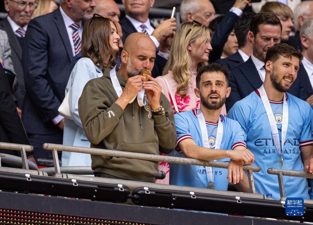 6月3日,曼城队主帅瓜迪奥拉(前左)赛后亲吻奖牌。