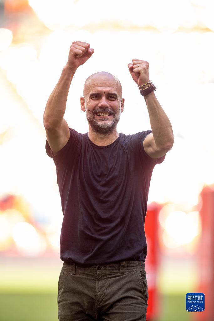 6月3日,曼城队主帅瓜迪奥拉赛后庆祝胜利。
