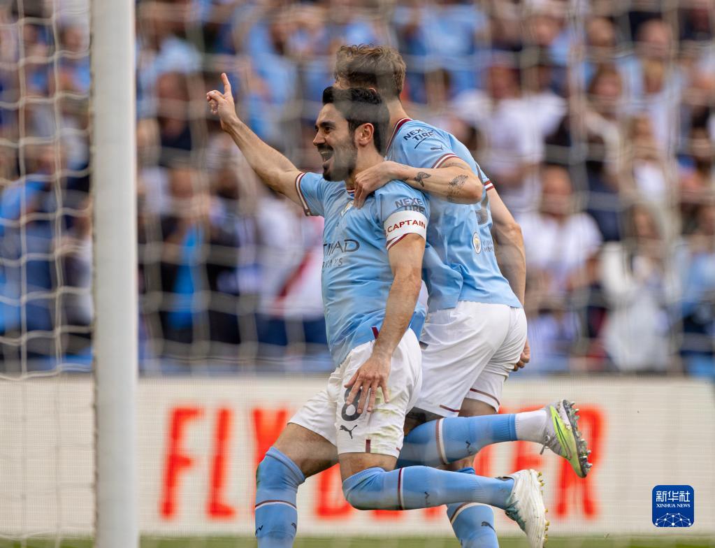 6月3日,曼城队球员京多安(左)在比赛中庆祝进球。