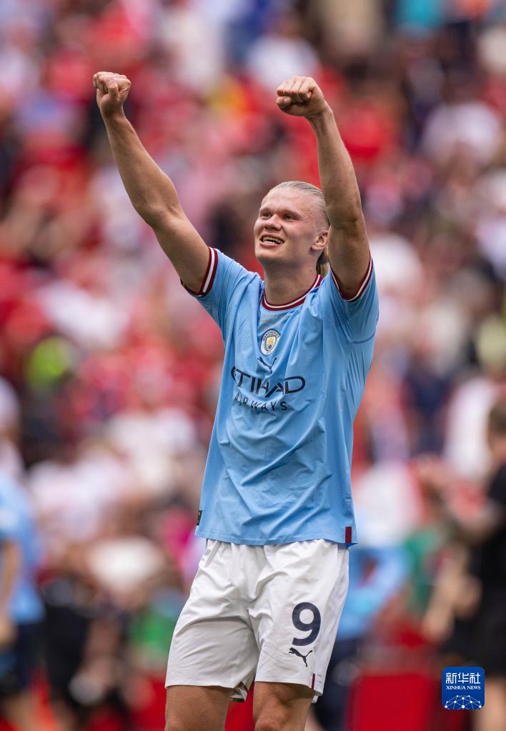 6月3日,曼城队球员哈兰德在比赛结束后庆祝胜利。