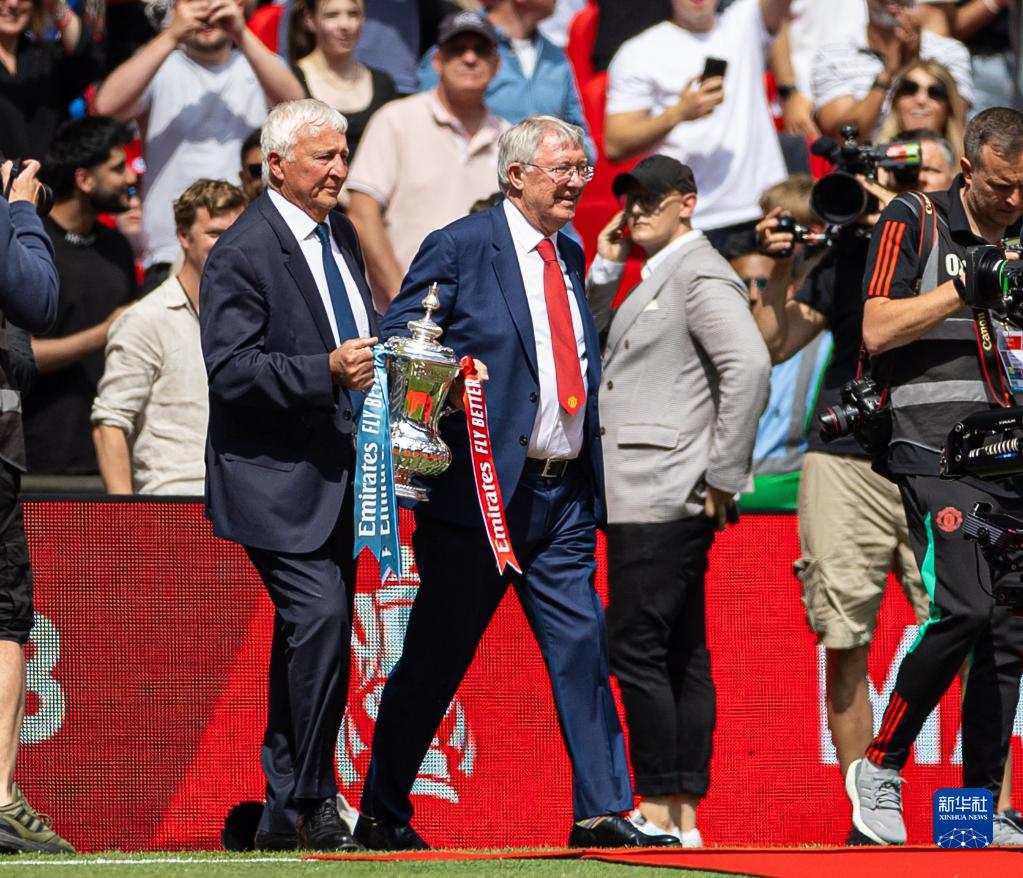 6月3日,前曼城队球星迈克·萨默比(前左)在比赛前与前曼联队传奇主帅弗格森手持冠军奖杯走入场内。