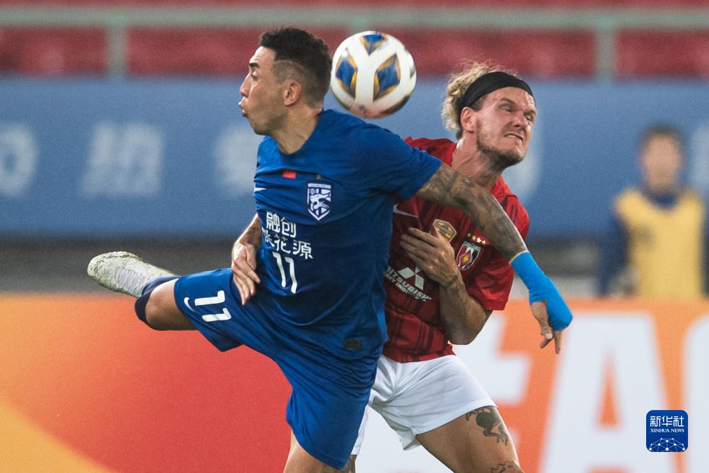 9月20日,武汉三镇队球员戴维森(左)与浦和红钻队球员亚历山大·舒尔茨在比赛中拼抢。新华社记者 肖艺九 摄