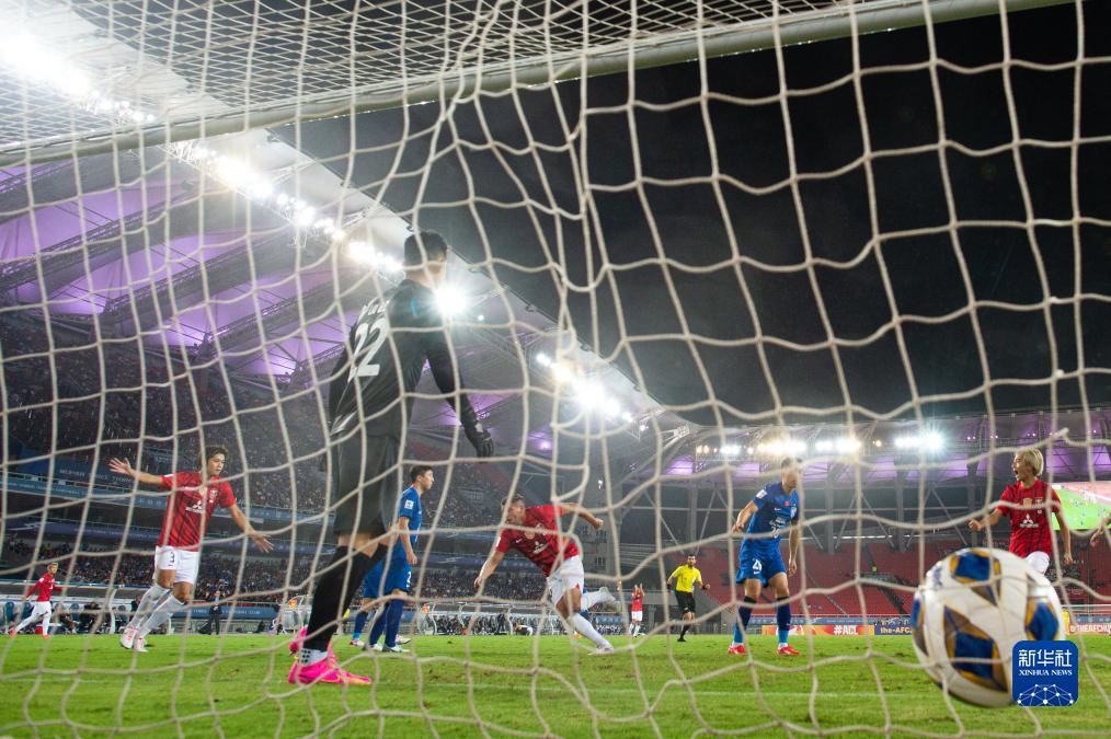 9月20日,武汉三镇队守门员刘殿座(前)在比赛中扑救失利。新华社记者 肖艺九 摄