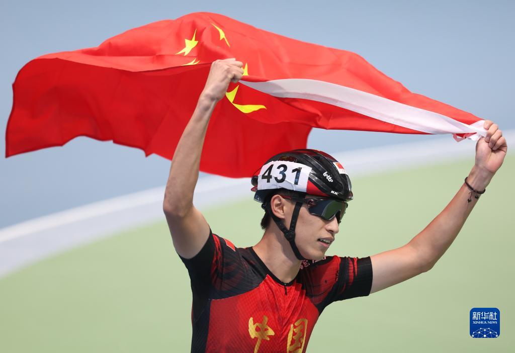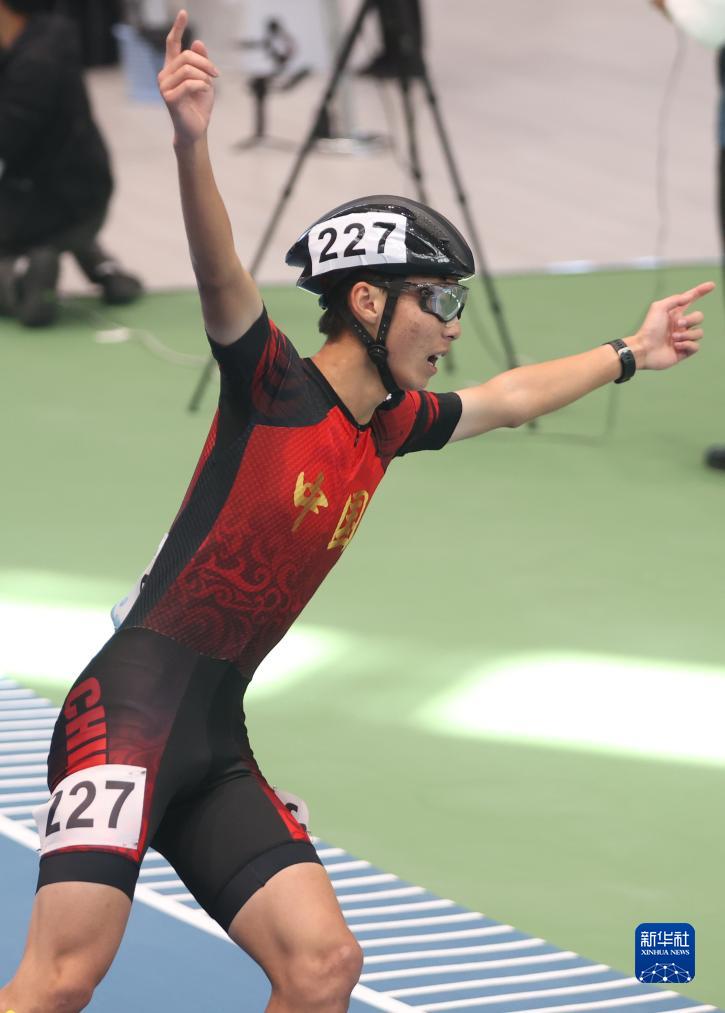 10月20日,中国选手张振海在比赛后庆祝。最终,他以18秒331的成绩夺得成年男子组200米追逐赛冠军。新华社记者 杨世尧 摄