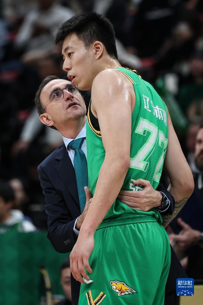 10月21日,辽宁本钢队主教练乌戈(左)在比赛中与球员张镇麟交流。新华社记者 潘昱龙 摄