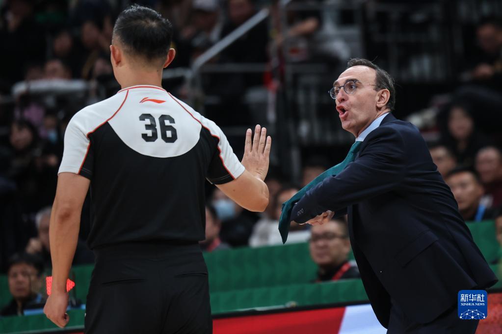 10月21日,辽宁本钢队主教练乌戈(右)在比赛中与裁判沟通。新华社记者 潘昱龙 摄