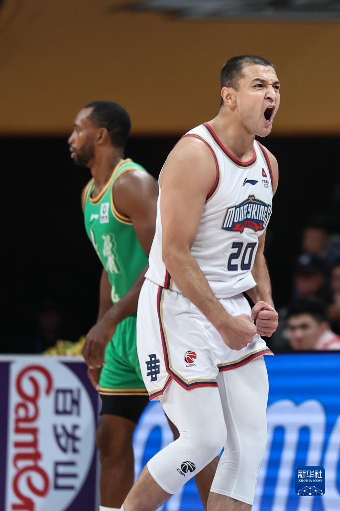 10月21日,南京头排苏酒队主教练兼球员西热力江(右)在比赛中庆祝得分。新华社记者 潘昱龙 摄
