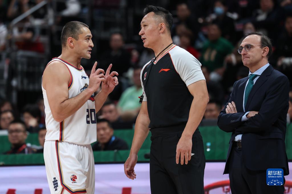 10月21日,南京头排苏酒队主教练兼球员西热力江(左)在比赛中与主裁判闫军(中)交流。新华社记者 潘昱龙 摄