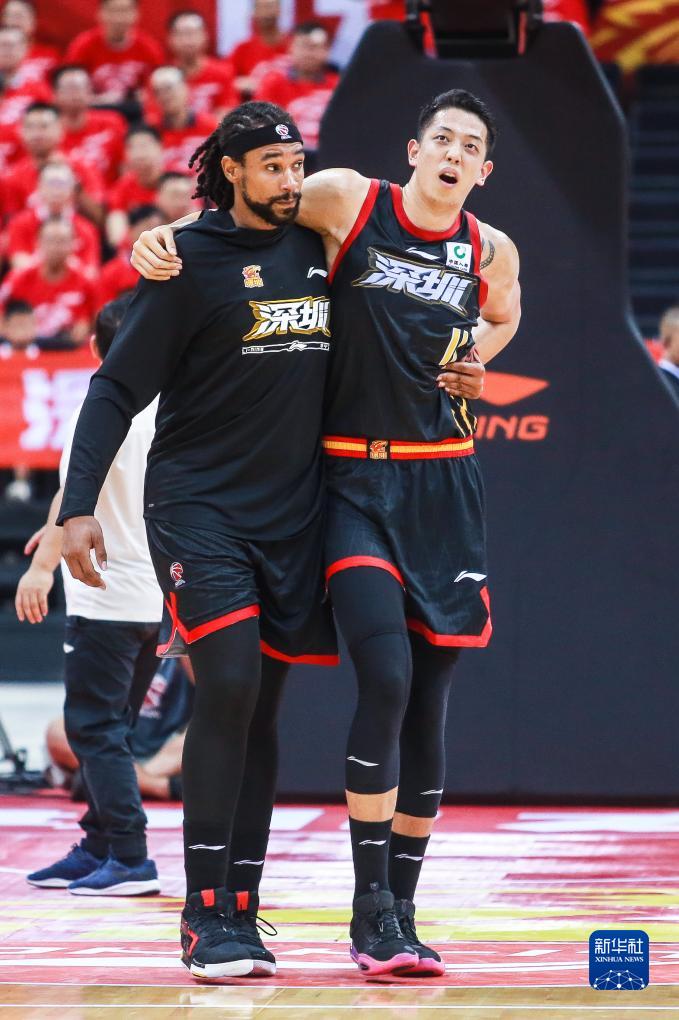 10月26日,深圳马可波罗队球员萨林杰(左)在比赛中搀扶受伤的队友沈梓捷下场。新华社发(彭志刚摄)