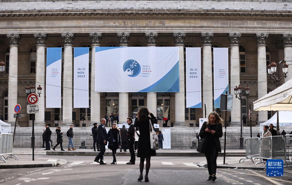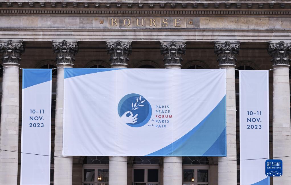 这是11月10日拍摄的巴黎和平论坛会场所在建筑物上的海报。新华社记者 高静 摄