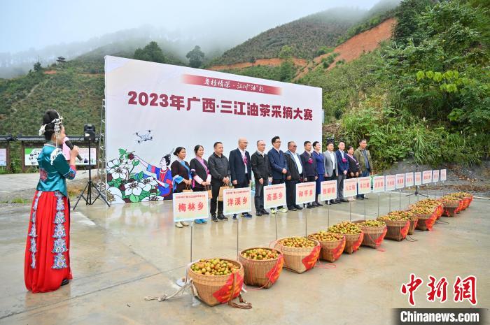 在三江县丹洲镇龙万山油茶基地,来自全县15个乡镇的45名采果能手参加油茶采摘大赛。大家穿梭于果实累累的油茶林,通过机器赛道竞速采果方式,现场展示三江油茶机械化发展成果,畅享丰收喜悦。