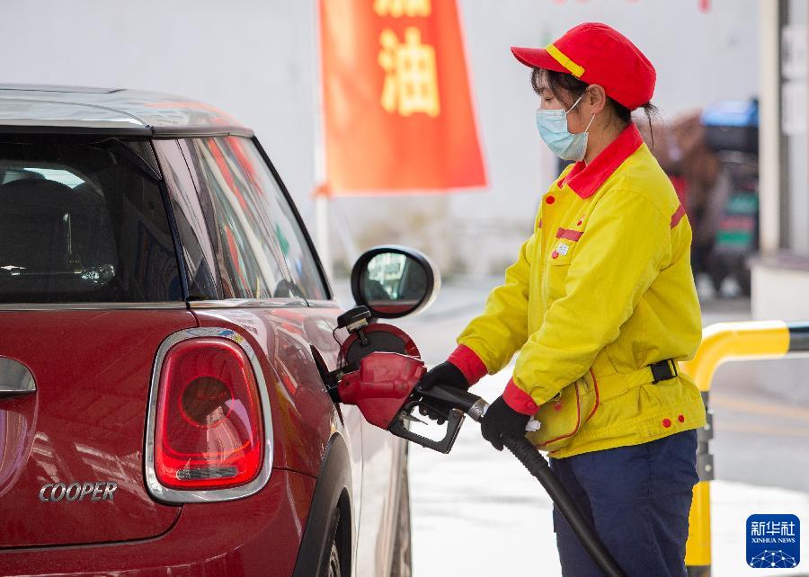3月3日,江苏南京一加油站的工作人员给车辆加油。 新华社发(苏阳 摄)
