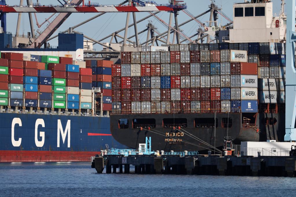 这是2021年10月29日在美国加利福尼亚州洛杉矶港拍摄的装满了集装箱的货船。(新华社发)