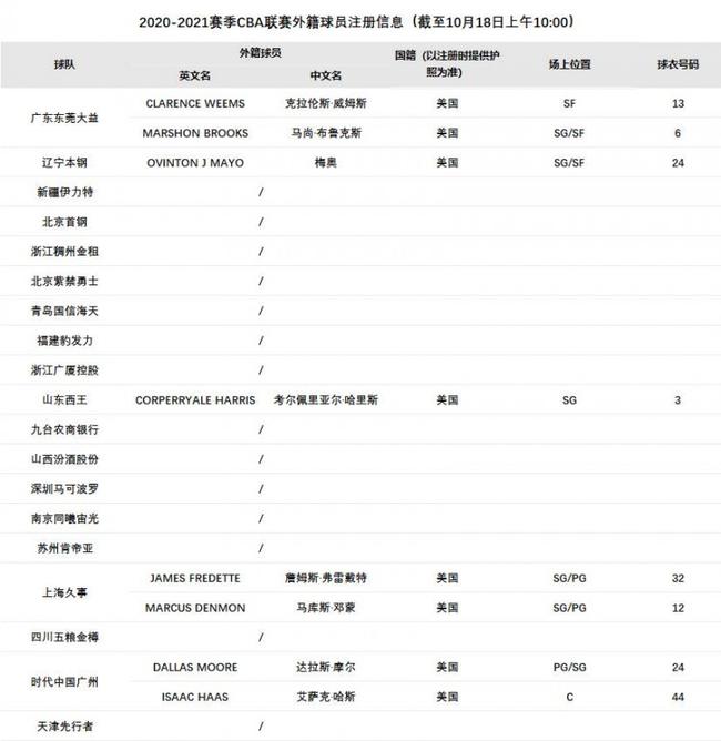 北京时间10月18日,CBA官方今日更新了20-21赛季CBA联赛外援注册信息(截至今日上午10:00),山东男篮曼尼-哈里斯、上海男篮吉默-弗雷戴特和马库斯-邓蒙、广州男篮达拉斯-摩尔和艾萨克-哈斯,均完成注册手续。