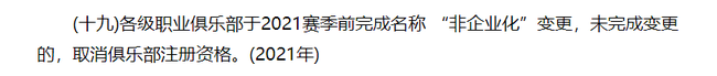 各级职业俱乐部于2021赛季前完成名称 “非企业化”变更,未完成变更的,取消俱乐部注册资格。