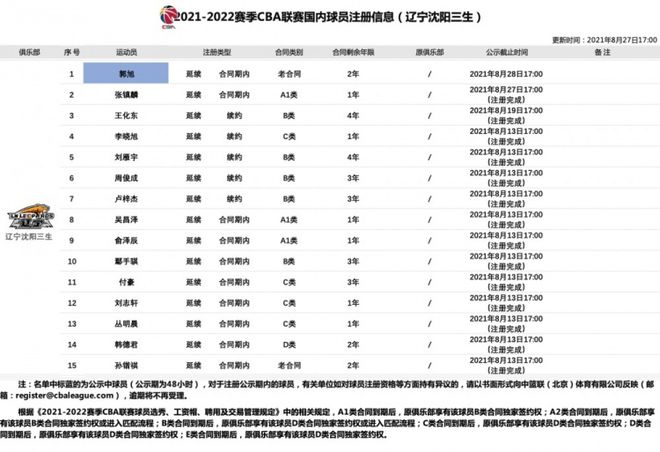 北京时间8月27日,CBA官方公布了辽宁男篮国内球员注册信息,郭旭完成注册。郭旭上赛季代表山东男篮出战4场比赛,没有得分进账。