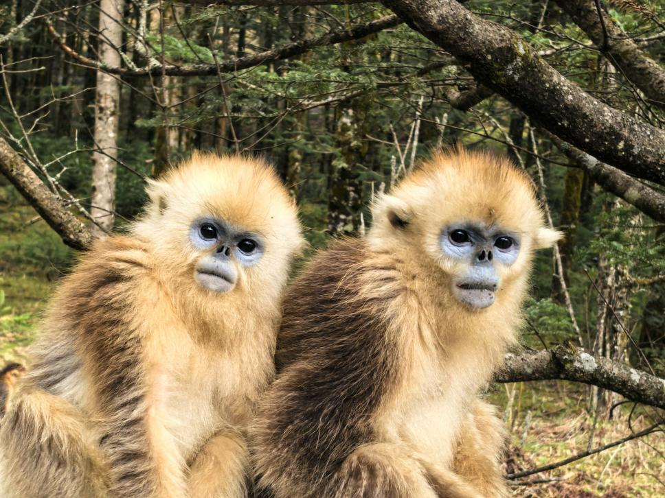 4月16日,两只神农架野生金丝猴在树枝上小憩。神农架是世界金丝猴分布最东端的地区,该种群是数量最少、最濒危的一个典型的孤立“小种群”。 神农架地区现分布有金丝猴11个种群、数量1618只,栖息地面积401平方公里。新华网记者 刘军 摄影