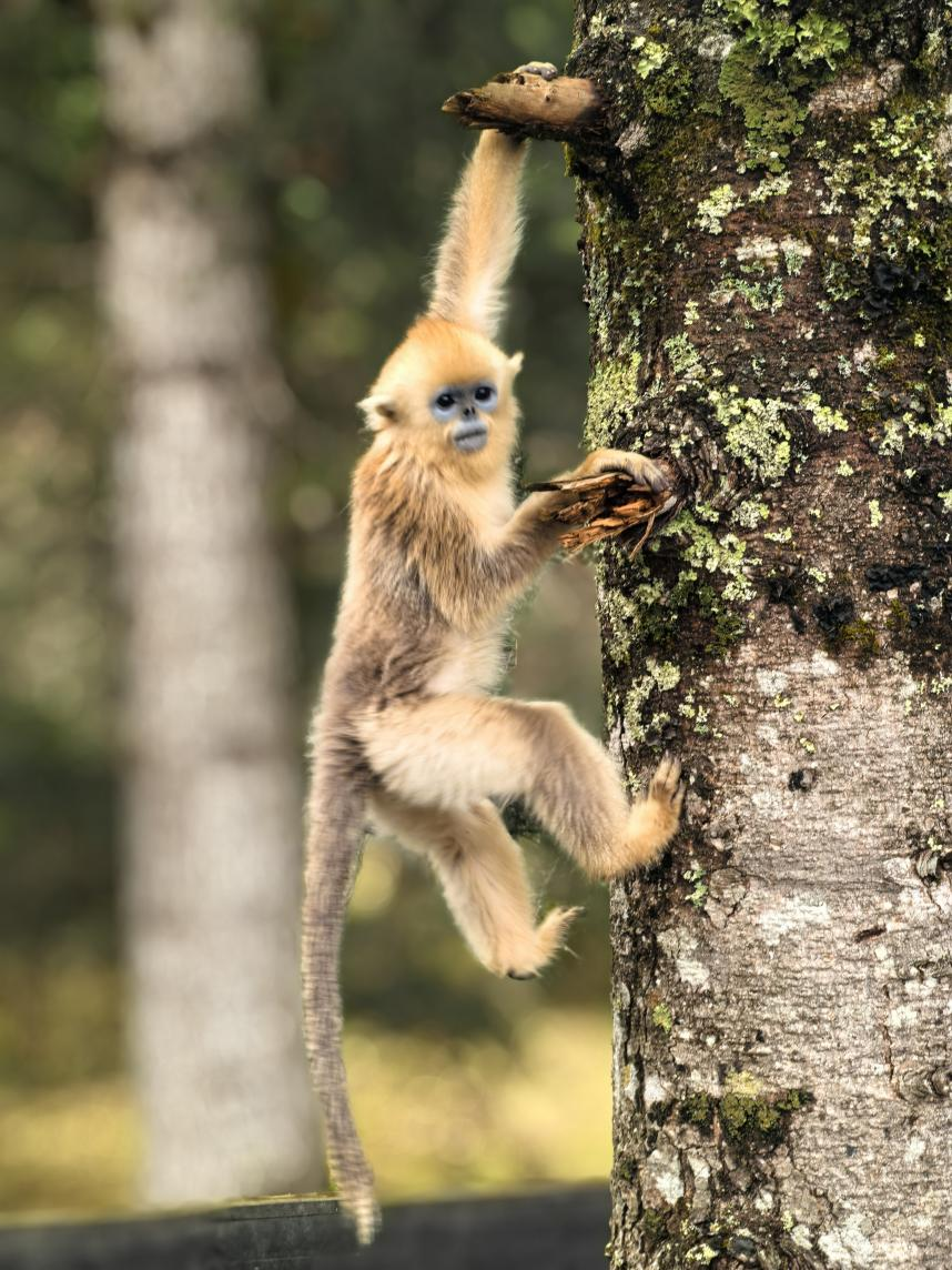4月16日,一只幼小的神农架野生金丝猴正在树上攀爬。神农架是世界金丝猴分布最东端的地区,该种群是数量最少、最濒危的一个典型的孤立“小种群”。 神农架地区现分布有金丝猴11个种群、数量1618只,栖息地面积401平方公里。新华网记者 刘军 摄影