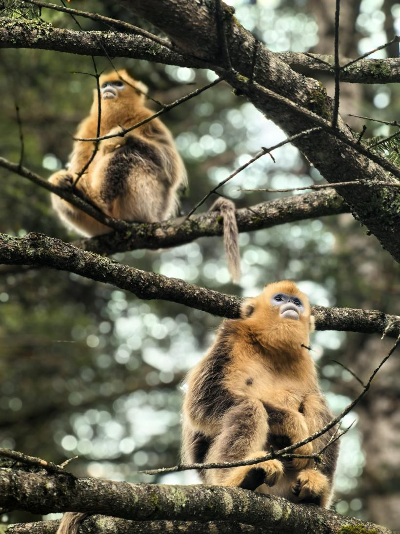4月16日,树丛中的两只神农架野生金丝猴。神农架是世界金丝猴分布最东端的地区,该种群是数量最少、最濒危的一个典型的孤立“小种群”。 神农架地区现分布有金丝猴11个种群、数量1618只,栖息地面积401平方公里。新华网记者 刘军 摄影