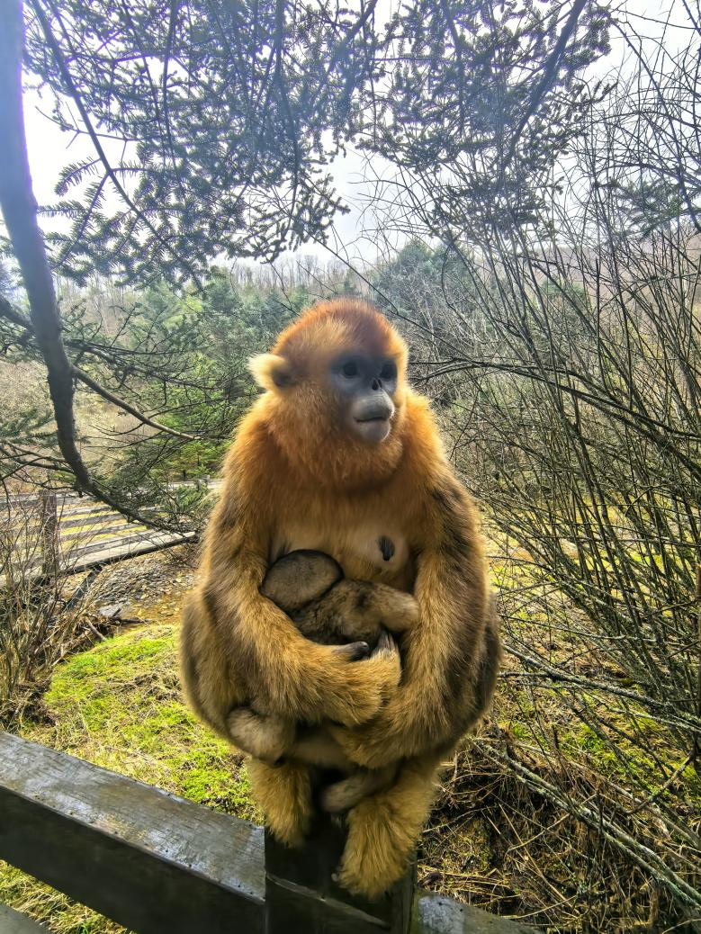 4月16日,一只怀抱幼崽的神农架野生金丝猴。神农架是世界金丝猴分布最东端的地区,该种群是数量最少、最濒危的一个典型的孤立“小种群”。 神农架地区现分布有金丝猴11个种群、数量1618只,栖息地面积401平方公里。新华网记者 刘军 摄影