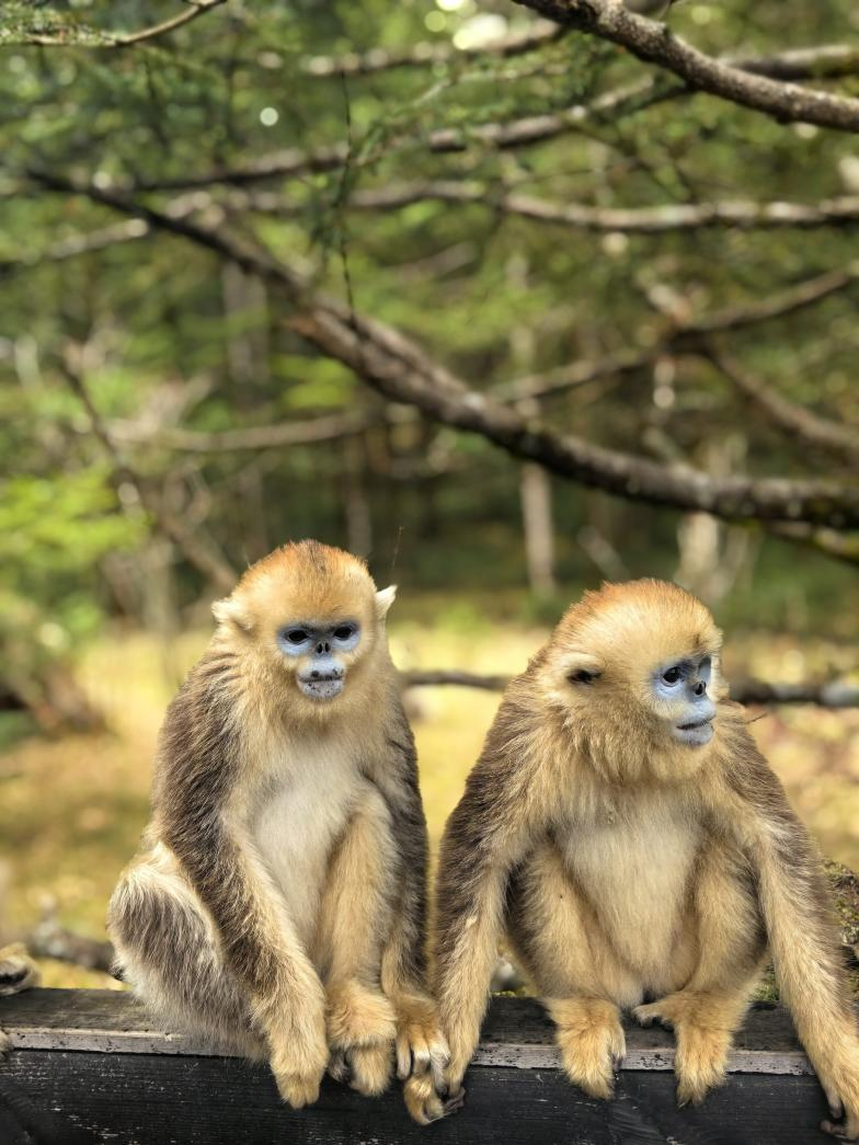 4月16日,神农架野生金丝猴研究基地附近等待工作人员投喂的两只野生金丝猴。神农架是世界金丝猴分布最东端的地区,该种群是数量最少、最濒危的一个典型的孤立“小种群”。 神农架地区现分布有金丝猴11个种群、数量1618只,栖息地面积401平方公里。新华网记者 刘军 摄影