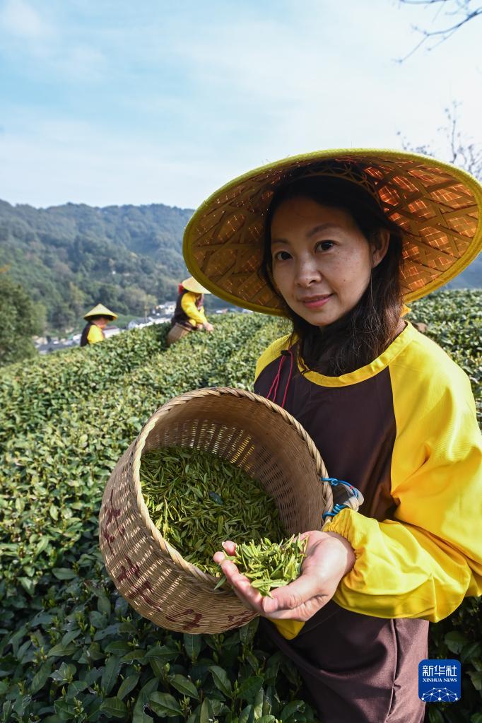 3月13日,龙井村的茶农徐雅军在展示刚刚采摘的西湖龙井鲜叶。