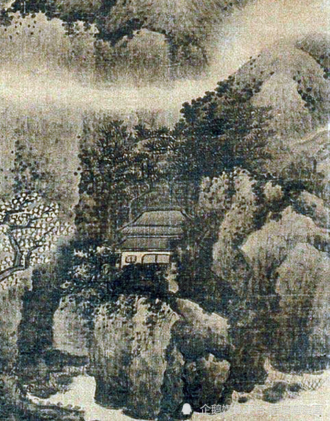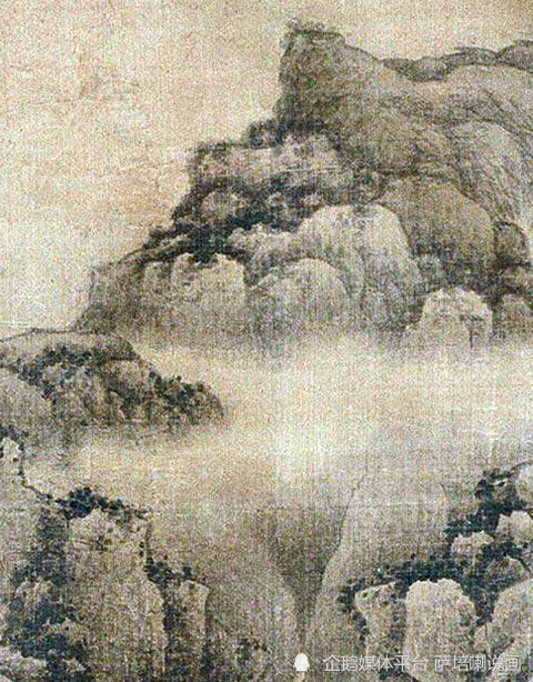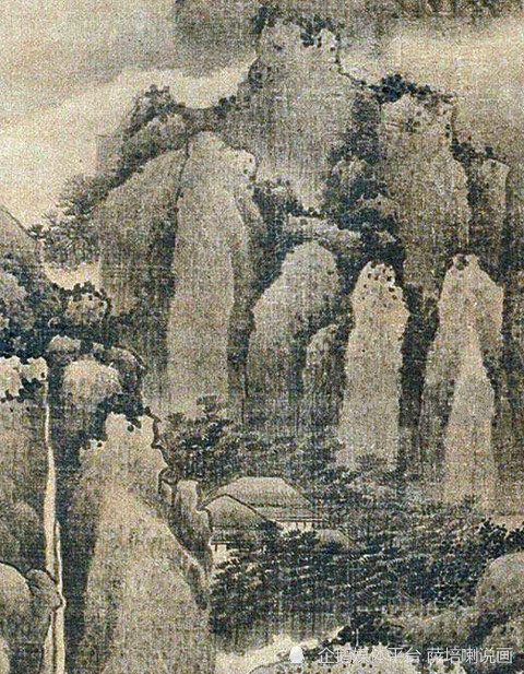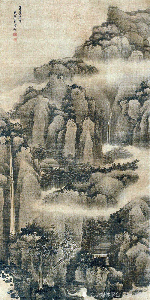 《匡庐飞瀑》近景墨色浓重,远景简淡疏旷,两种截然不同的风格竟然可以完美融合。近景重皴染,远景重点染,笔墨之丰富,堪称淡远苍秀。他把书法中的飞白入画,似皴非皴,而是皴法和笔法合二为一。这是他的独创,也是近景沉厚苍润的原因。
