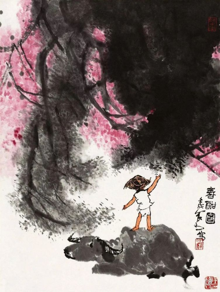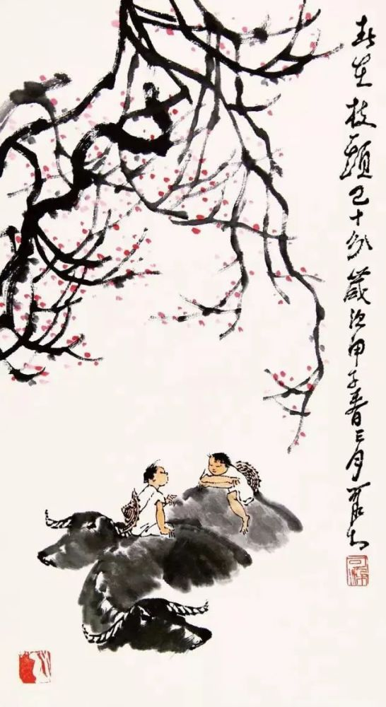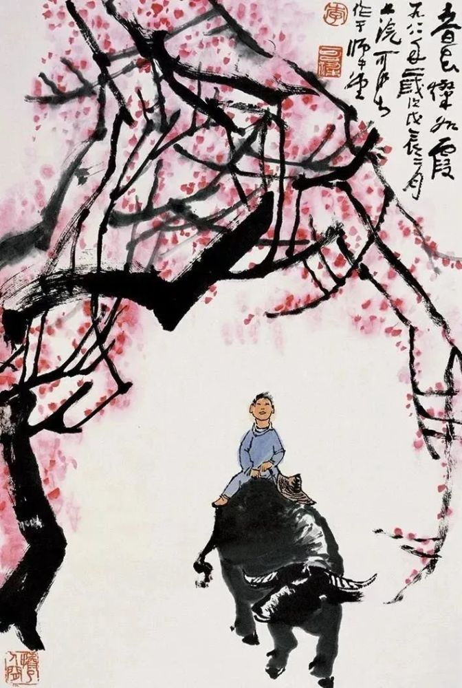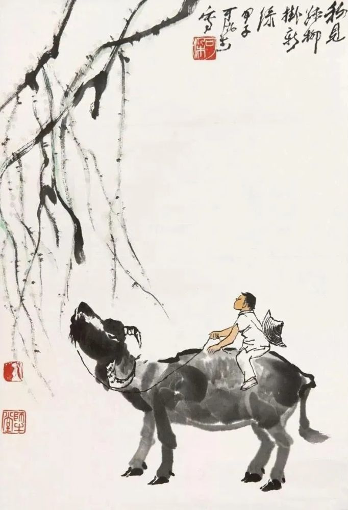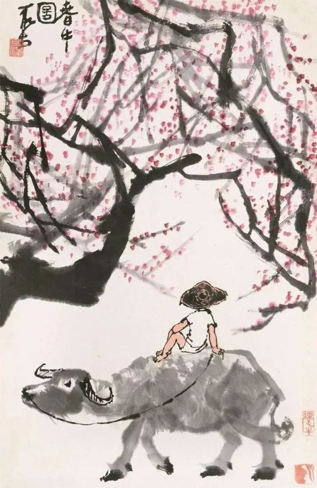 敦实憨厚、信步前行的老牛,灵巧稚拙、神情专注的牧童,疏放恬淡、顺逆交错的老树........在充满希望的春季里,为人们带来新鲜的、撩动心弦的惊喜,也带来淳朴的、高尚之美的趣味,令人赏之倍感舒心愉悦!
