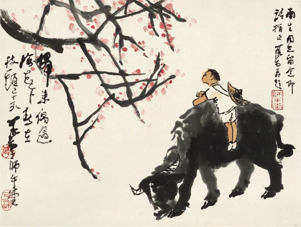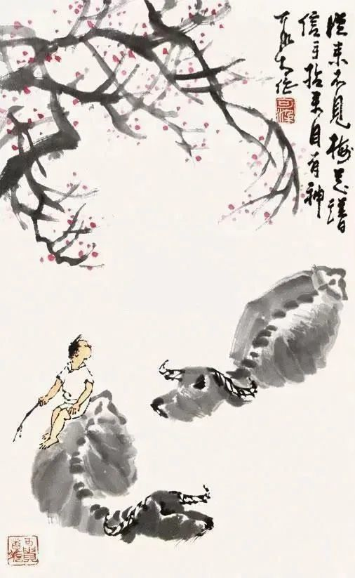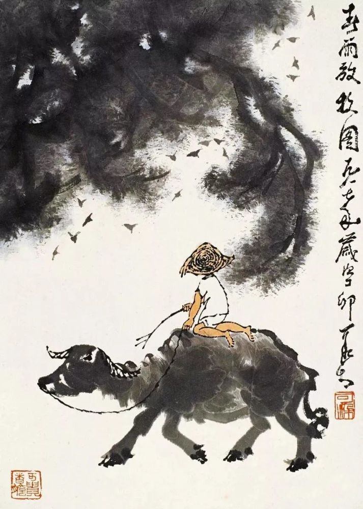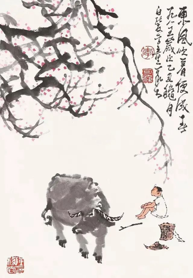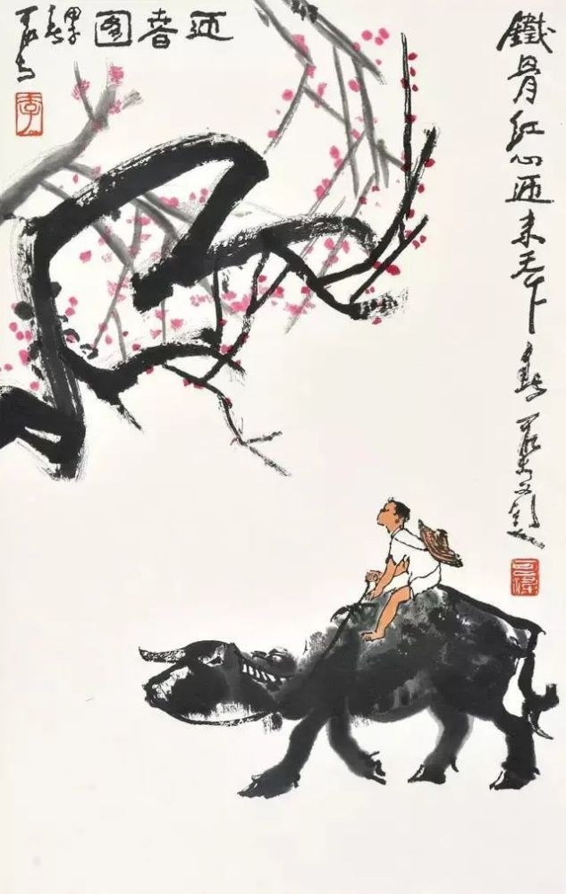 敦实憨厚、信步前行的老牛,灵巧稚拙、神情专注的牧童,疏放恬淡、顺逆交错的老树........在充满希望的春季里,为人们带来新鲜的、撩动心弦的惊喜,也带来淳朴的、高尚之美的趣味,令人赏之倍感舒心愉悦!