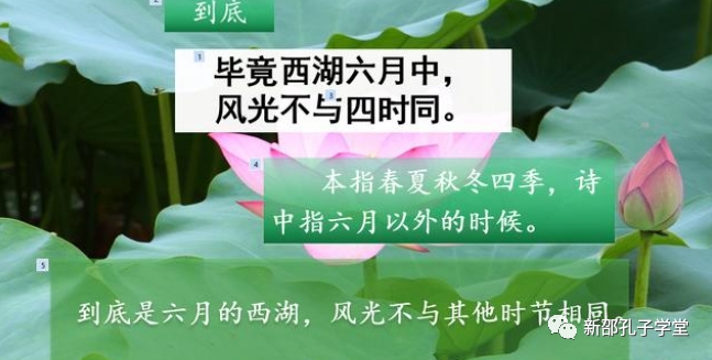 “毕竟西湖六月中,风光不与四时同”,诗人开篇即说毕竟六月的西湖,风光不与四时相同,这两句质朴无华的诗句,说明六月西湖与其他季节不同的风光,是足可留恋的。这两句是写六月西湖给诗人的总的感受。“毕竟”二字,突出了六月西湖风光的独特、非同一般,给人以丰富美好的想象。首句看似突兀,实际造句大气,虽然读者还不曾从诗中领略到西湖美景,但已能从诗人赞叹的语气中感受到了。诗句似脱口而出,是大惊大喜之余最直观的感受,因而更强化了西湖之美。