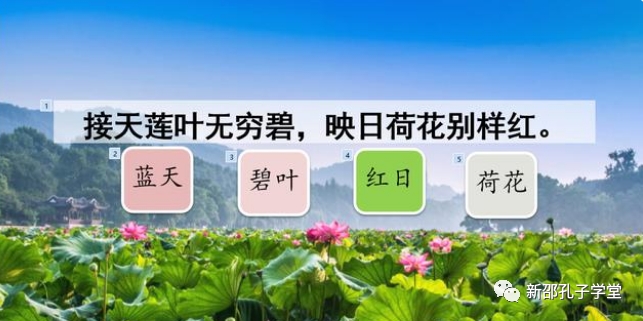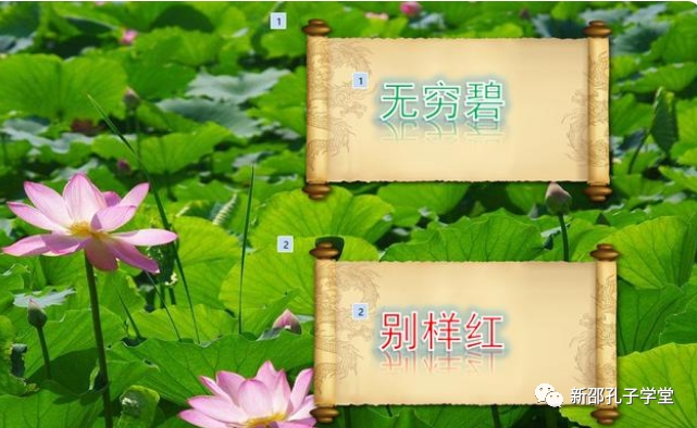 然后,诗人用充满强烈色彩对比的句子,给读者描绘出一幅大红大绿、精彩绝艳的画面:“接天莲叶无穷碧,映日荷花别样红。”这两句具体地描绘了“毕竟”不同的风景图画:随着湖面而伸展到尽头的荷叶与蓝天融合在一起,造成了“无穷”的艺术空间,涂染出无边无际的碧色;在这一片碧色的背景上,又点染出阳光映照下的朵朵荷花,红得那么娇艳、那么明丽。连天“无穷碧”的荷叶和映日“别样红”的荷花,不仅是春、秋、冬三季所见不到,就是夏季也只在六月中荷花最旺盛的时期才能看到。诗人抓住了这盛夏时特有的景物,概括而又贴切。这种在谋篇上的转化,虽然跌宕起伏,却没有突兀之感。看似平淡的笔墨,给读者展现了令人回味的艺术境地。