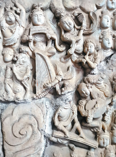 北京房山万佛堂浮雕现存两组伎乐天人,是真实反映盛唐时代音乐发展的宝贵资料。乐手手持筚篥、拍板、排箫、箜篌、腰鼓等乐器,画面中更有人跳起胡旋舞,特别是其中一人摇摆身姿,右手执拨横弹五弦琵琶,沉浸乐声的神情,仿佛活化了白居易“五弦弹,五弦弹,听者倾耳心寥寥”的意境。