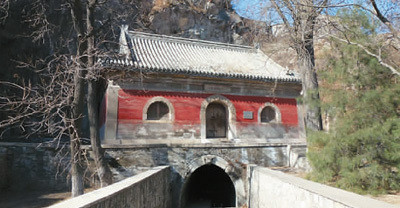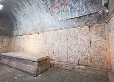 经过一年施工,孔水洞正上方建起了一座砖石结构的无梁殿。人们又把殿后大像龛里残破的浮雕石板拆卸下来,镶嵌到殿内三面墙上。