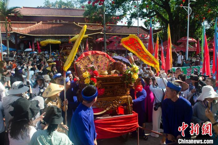 “哈”在京语是唱歌的意思。当天上午,东兴市江平镇哈亭里彩旗飘扬、锣鼓喧天,中越两国民众身着民族盛装,到海边将海神迎回哈亭敬奉、祭祀(含唱哈),祈求风调雨顺、渔业丰收、人丁兴旺。当京族独特的百人独弦琴奏响时,悠扬的旋律回荡在东兴金滩上空。