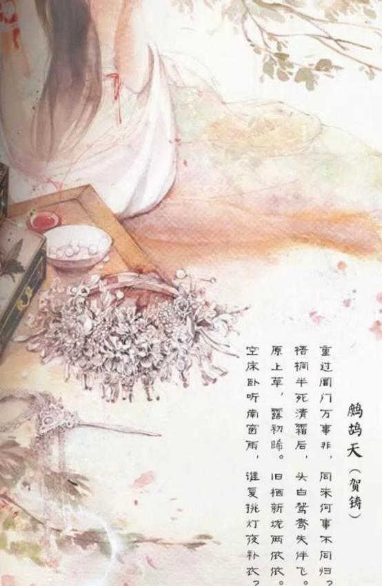 这是另一个著名北宋词人贺铸的作品。比起苏轼,贺铸的人生经历更加坎坷困顿,从未有过顺意时,因此,他和妻子的感情也更有相濡以沫的意味。晚年,他在苏州客居期间,妻子病逝。