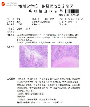 ▲郑大一附院呼吸内科关于张琦的《支气管镜检查报告》和《病理检查报告单》