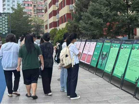 在校园内的反邪教展览中,大一新生排队观看反邪教展板,当看到“法轮功学员自焚”、“招远全能神血案”时,震惊且愤恨邪教的罪恶和危害,纷纷表示一定坚决反对任何邪教活动,做新时代好青年,为建设祖国而努力奋斗。