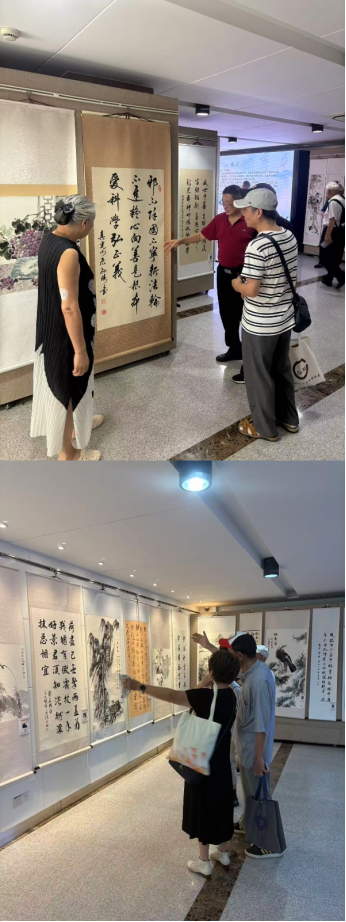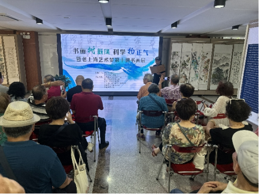 曹杨书画协会艺术家创作的88幅反邪教主题书画作品,与宣传展板相得益彰——既通过艺术创作传递正向理念,又依托展板强化警示教育功能,让静态展览变成了“会说话的反邪教课堂”,显著提升了宣传的感染力、互动性与覆盖面。近百名书画艺术家、社区居民及业余大学、老年大学学员共同到场观展,现场氛围热烈。