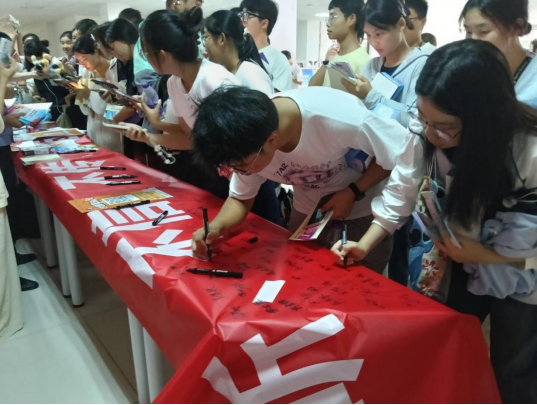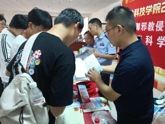 在图书馆一楼大厅的反邪教宣传区,醒目横幅与排列整齐的展板构成宣传主阵地,展板以真实案例为核心揭露邪教危害。工作人员现场发放警示教育读本、折页及《咸宁市涉邪教违法犯罪线索举报奖励办法》,政法干警同步开展讲解,鼓励学生成为反邪教“青春力量” 。互动环节中,学生们在观看展板后,踊跃参与“中国反邪教”公众号“对邪教说不”签名与答题活动,签名区前有序落笔的身影,彰显着青年抵制邪教的坚定决心。
