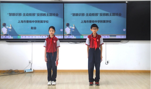 邪教的触角是否会伸向纯净的校园?学生能否识破披着“学习捷径”“保平安”外衣的邪教陷阱?日前,上海市普陀区曹杨中学附属学校(下文简称“曹杨附校”)与普陀区教育学院附属中学(下文简称“教院附中”)分别开展反邪教主题班会,通过情景剧、AI案例、小组辩论等创新形式,将“慧眼识邪 主动拒邪”的种子深植学生心中。一场场生动的课堂实践,既是警示教育,更是一场守护青春成长的“思想防御战”。